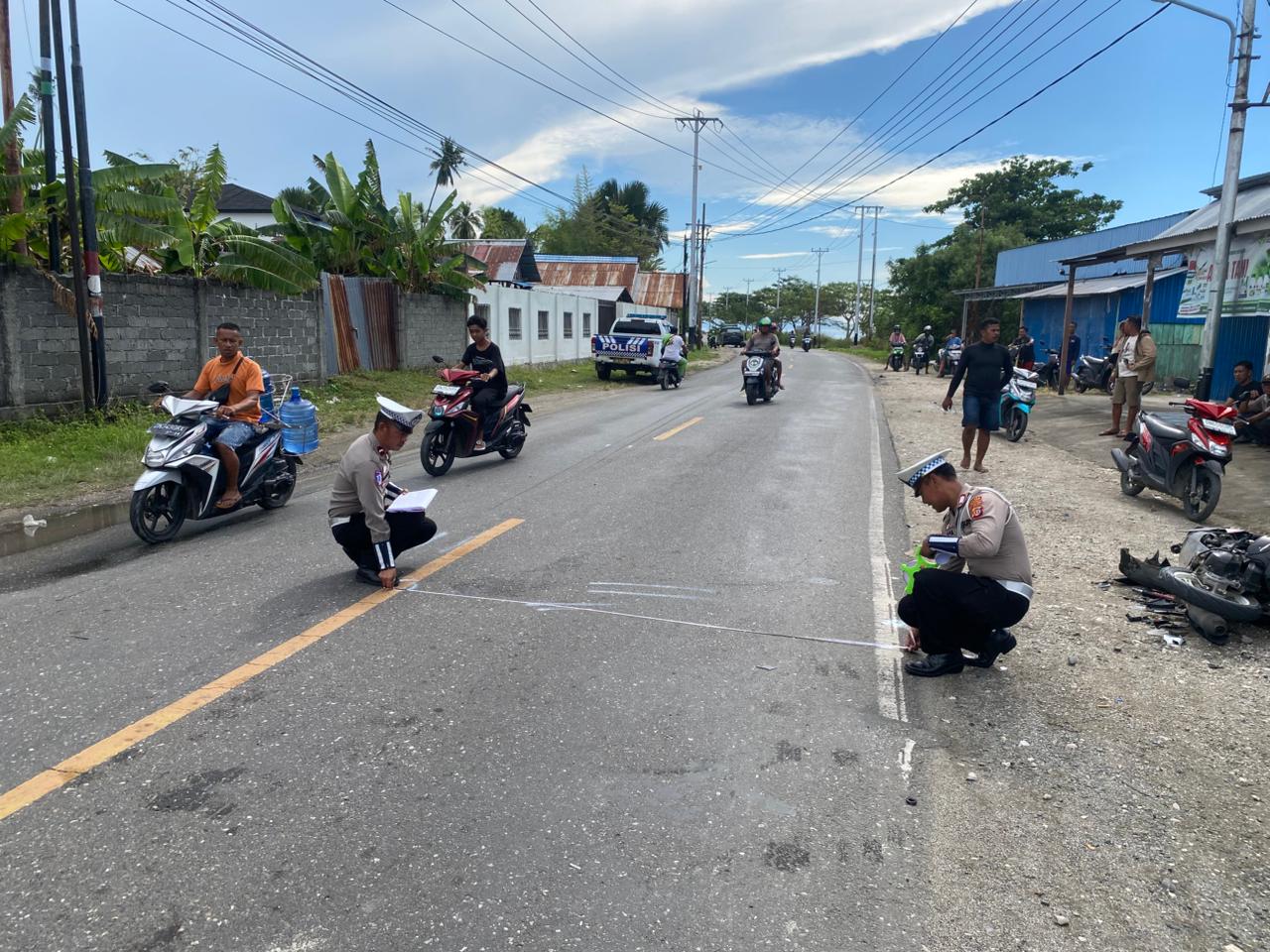 Kegiatan olah TKP oleh Unit Laka Satlantas Polres Banggai ini berlangsung di Jalan Trans Sulawesi Desa Biak, Luwuk Utara, Jumat (31/10/2025) pagi.