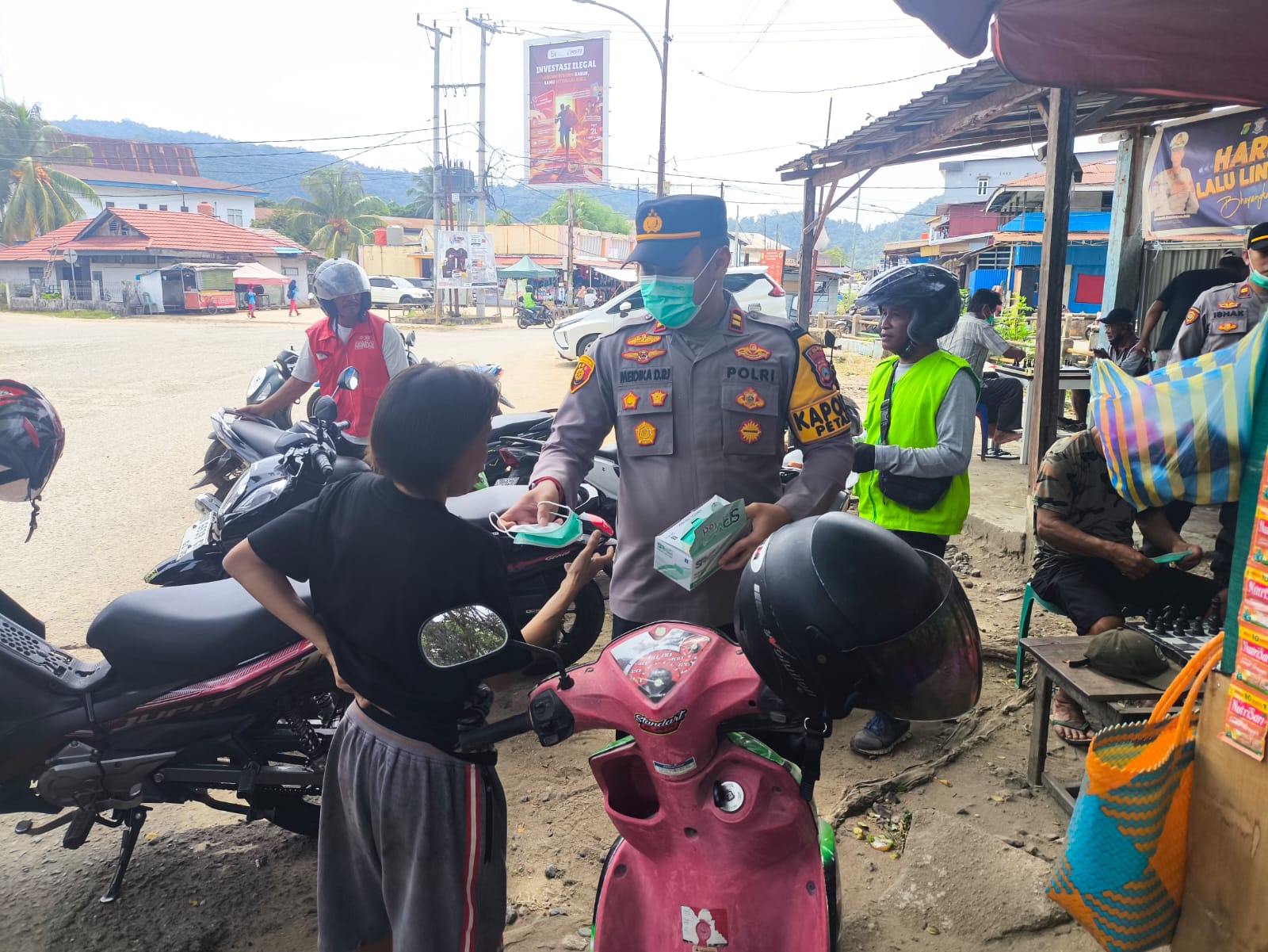 Dalam rangka mengantisipasi kembali meningkatnya kasus ISPA. Kapolres Morowali Utara AKBP Reza Khomeini, S.I.K. memerintahkan seluruh Satuannya termasuk Polsek Petasia untuk membagikan masker gratis kepada warga.