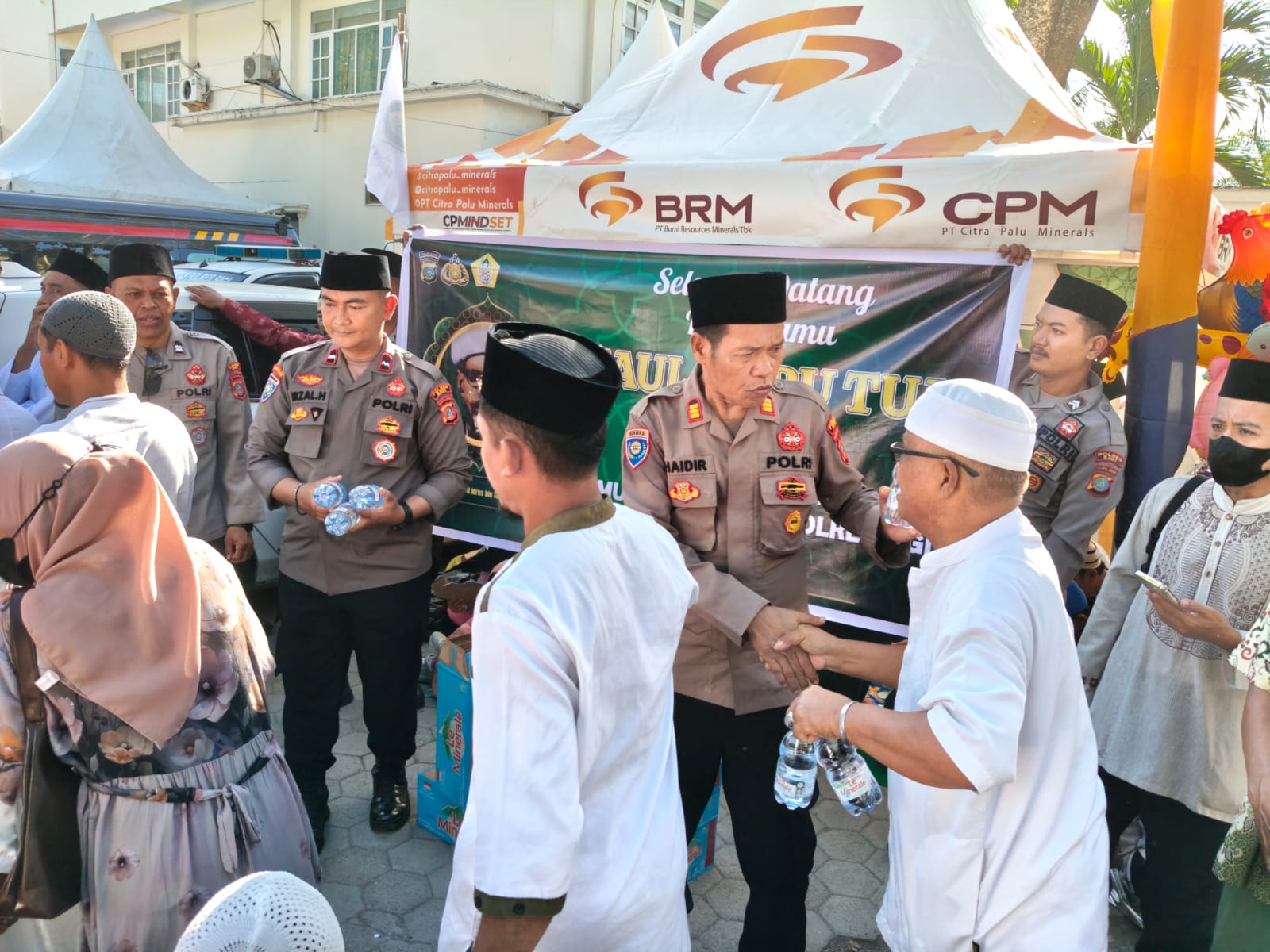 Melalui personel Satuan Pembinaan Masyarakat (Binmas), Polres Sigi turut melayani jamaah dengan membagikan air mineral sebagai bentuk penghormatan kepada para tamu haul yang datang dari berbagai daerah.