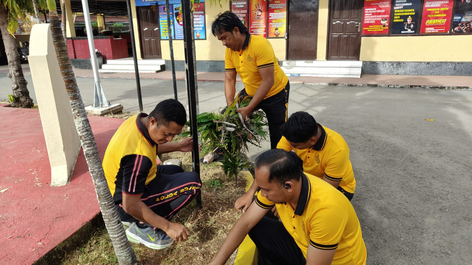 Personel terlihat bahu-membahu membersihkan berbagai area, mulai dari memungut sampah, mencabut rumput liar, menyapu halaman, merapikan ruangan kantor, membersihkan saluran air, hingga memangkas ranting pohon di sekitar Mako.