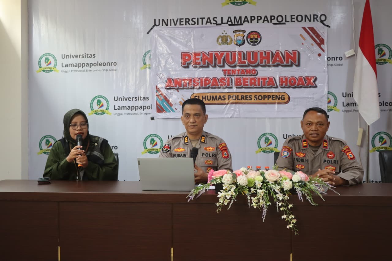 Soppeng, fokustime.id – Dalam upaya memperkuat literasi digital dan mencegah penyebaran berita bohong di kalangan generasi muda, Satuan Humas Polres Soppeng bersama Satuan Binmas Polres Soppeng melaksanakan penyuluhan tentang antisipasi berita hoaks di Universitas Lamappapoleonro (Unipol). Senin, 3 November 2025.