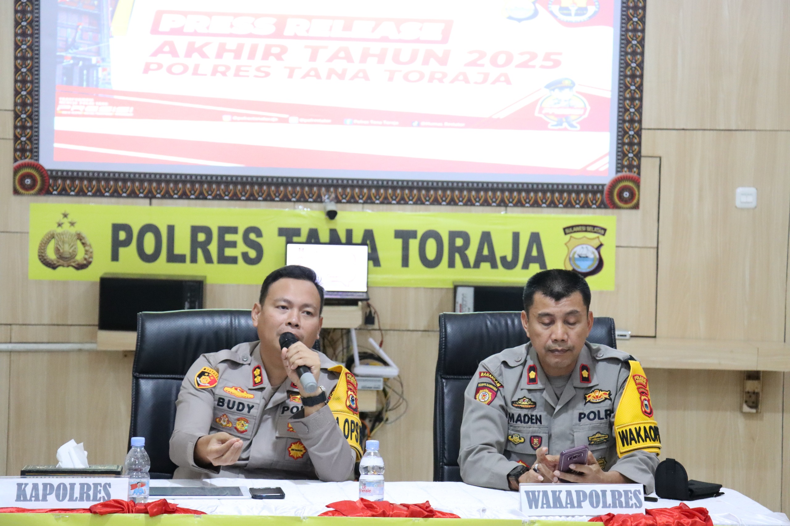 Press release akhir tahun 2025 dipimpin oleh Kapolres Tana Toraja AKBP Budi Hermawan, didampingi oleh Waka Polres dengan memaparkan situasi Kamtibmas selama tahun 2025 dan perbandingan tahun 2024