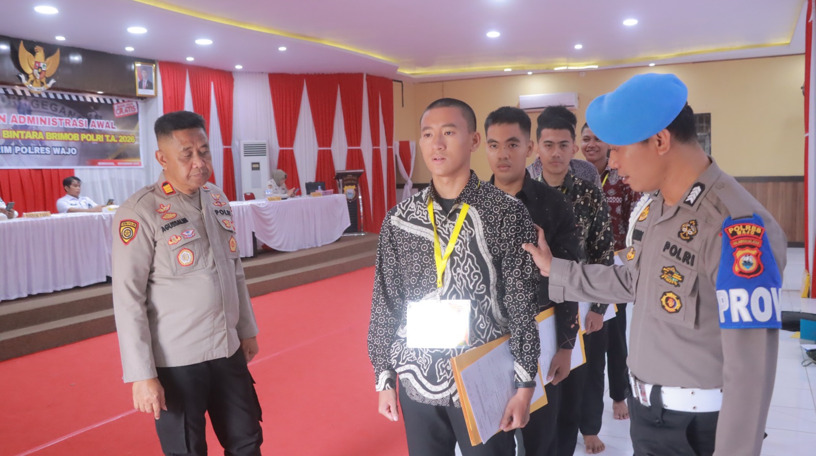 Kapolres Wajo AKBP Muhammad Rosid melalui Kasi Humas Polres Wajo IPTU Kaomi menyampaikan Polres Wajo melalui Panitia Penerimaan Bintara (Pabanrim) melaksanakan pemeriksaan administrasi awal atau Rikmin Awal bagi para calon peserta seleksi Bintara Brimob Tahun Anggaran 2026. Kegiatan tersebut berlangsung pada Rabu, 19 November 2025, bertempat di Aula Sandi Polres Wajo.