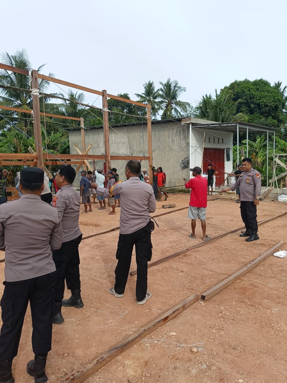 Kegiatan sosial tersebut dilakukan untuk membantu salah satu warga dalam proses pendirian rumah panggung. Kehadiran Kapolsek dan jajaran disambut antusias oleh masyarakat yang bersama-sama bergotong royong menyelesaikan pekerjaan.