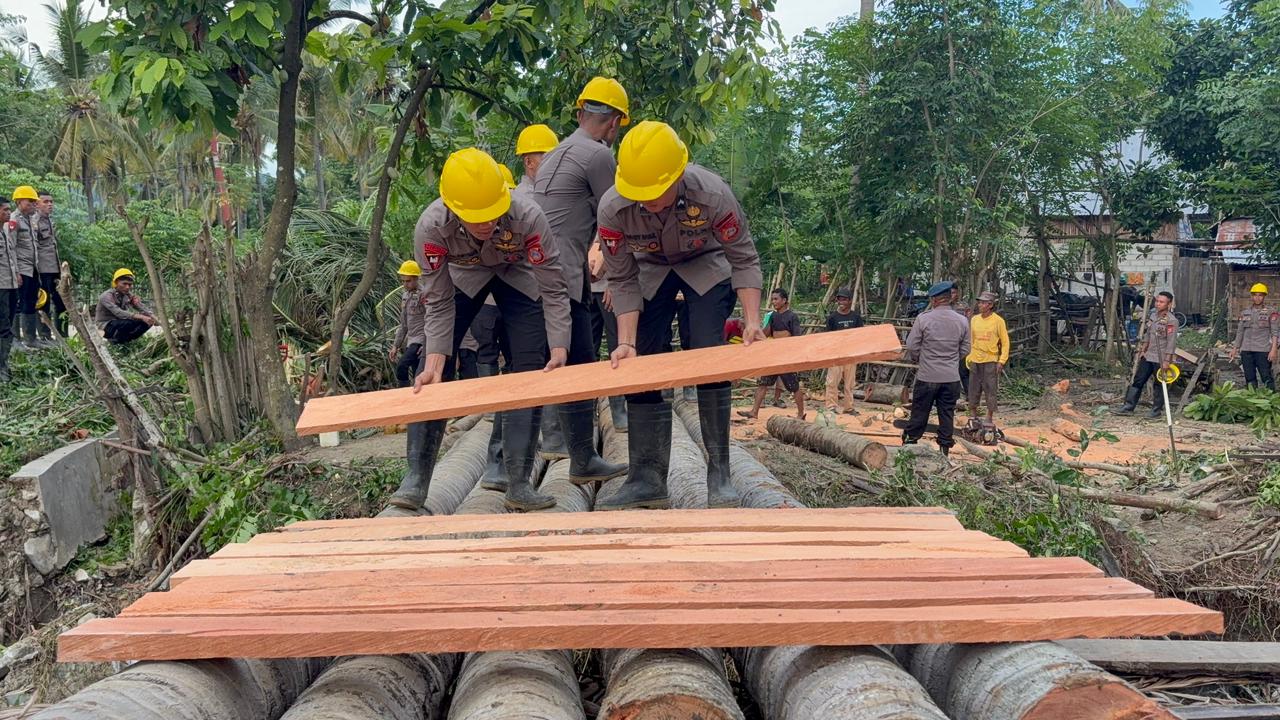 Pembangunan jembatan sementara ini merupakan hasil kolaborasi antara personel Brimob, dinas teknis pemerintah daerah, serta unsur TNI untuk memberikan solusi cepat bagi mobilitas warga. Dengan memanfaatkan material batang pohon kelapa, jembatan ini dirancang agar dapat segera dilalui oleh pejalan kaki serta masyarakat yang sempat terisolasi akibat kerusakan infrastruktur jalan.