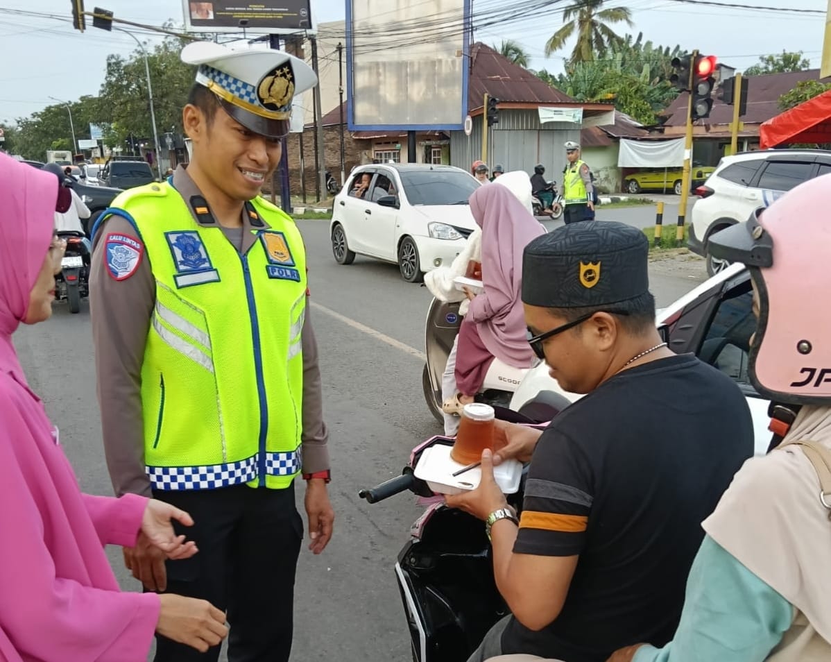 Selain membagikan takjil, personel Sat Lantas juga memanfaatkan kesempatan ini untuk menyampaikan imbauan keselamatan berkendara dan pentingnya menjaga ketertiban lalu lintas selama Ramadhan.