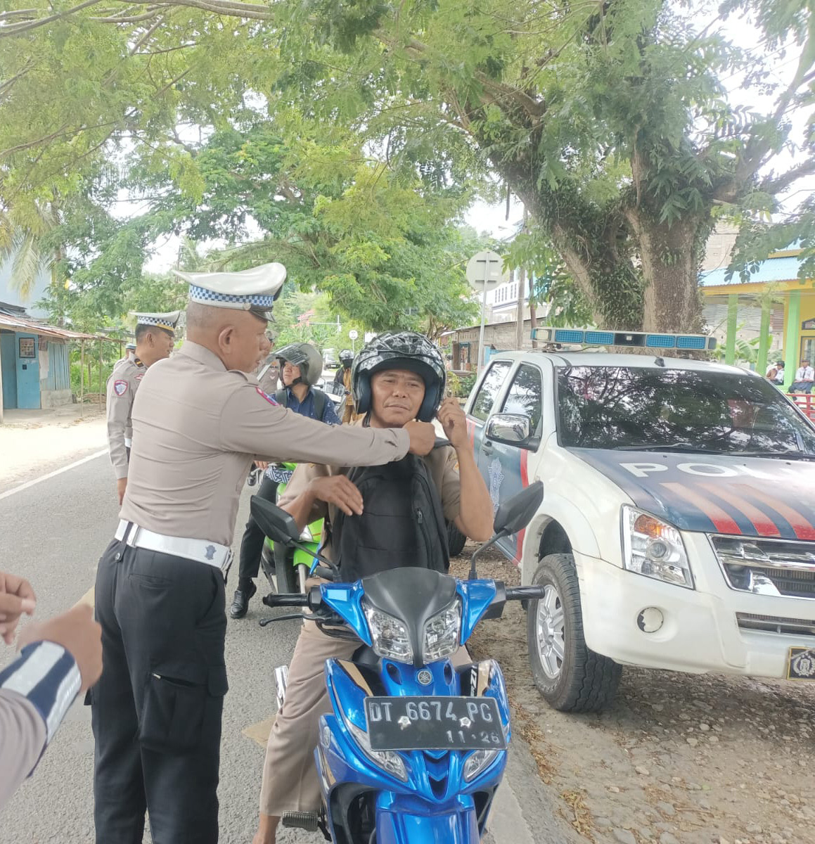 Para personel menjelaskan bahwa penggunaan helm sangat penting untuk melindungi kepala dari risiko cedera serius maupun fatal apabila terjadi kecelakaan lalu lintas. Selain itu, penggunaan helm juga merupakan kewajiban yang diatur dalam peraturan perundang-undangan lalu lintas.
