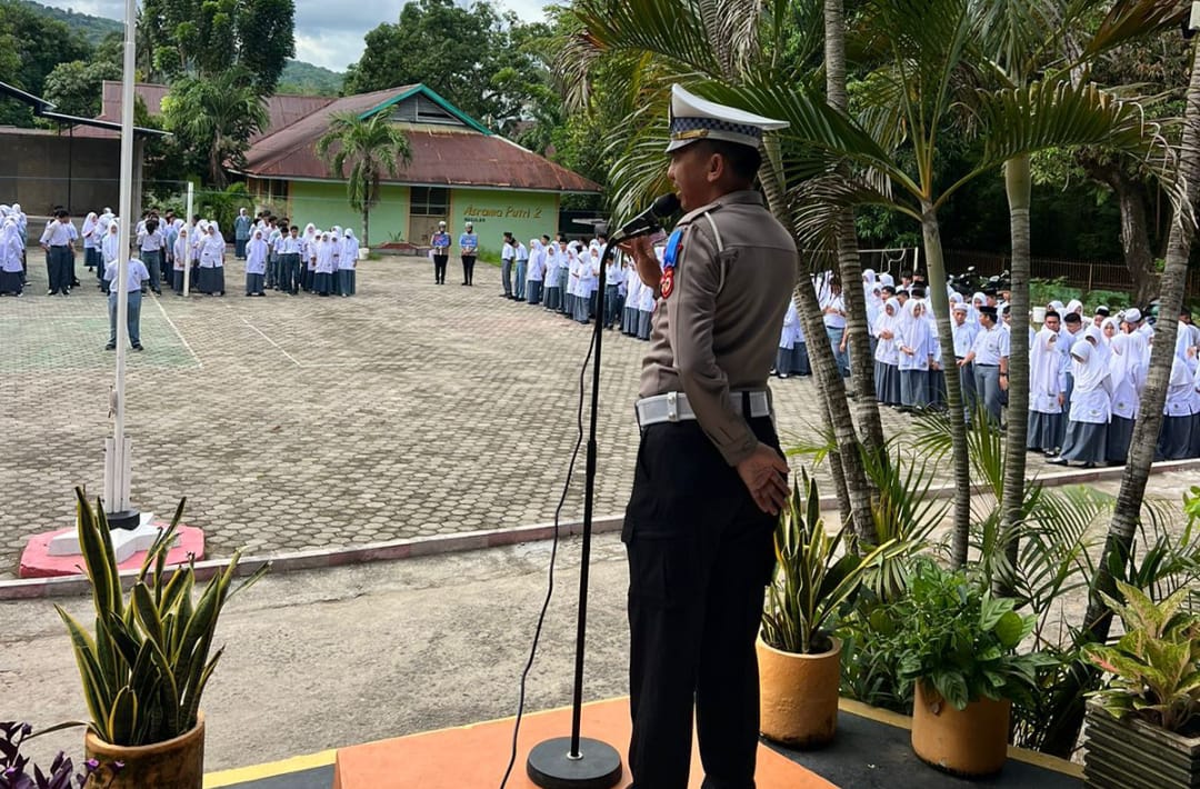 “Sering kita temukan pelajar tidak menggunakan helm, tidak memasang plat kendaraan, main handphone saat berkendara, hingga berboncengan lebih dari satu. Bahkan ada yang membawa anak di bawah umur,” ujar AKP Arsyad di hadapan ratusan siswa.