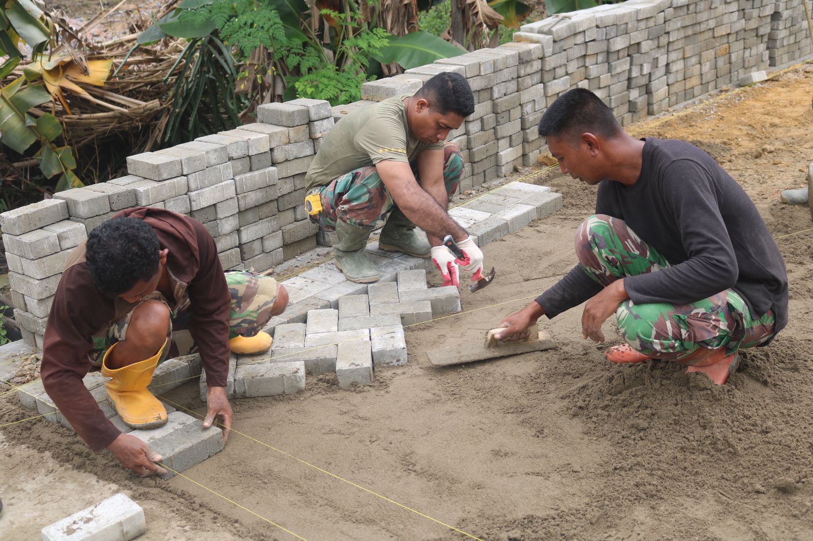 Dengan semangat gotong royong, pengerjaan dilakukan dengan teliti mulai dari perataan tanah hingga penyusunan material secara presisi.