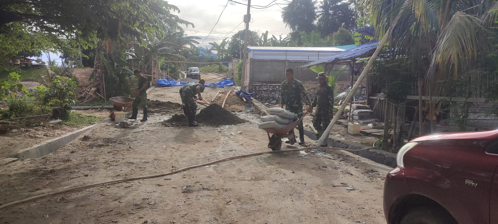 Material tersebut disiapkan untuk proses plesteran dinding talud guna memastikan struktur bangunan kokoh dan tahan lama. Meski medan di lapangan cukup menantang, semangat gotong royong antara prajurit TNI dan warga setempat tetap terjaga demi merampungkan infrastruktur tersebut tepat waktu.