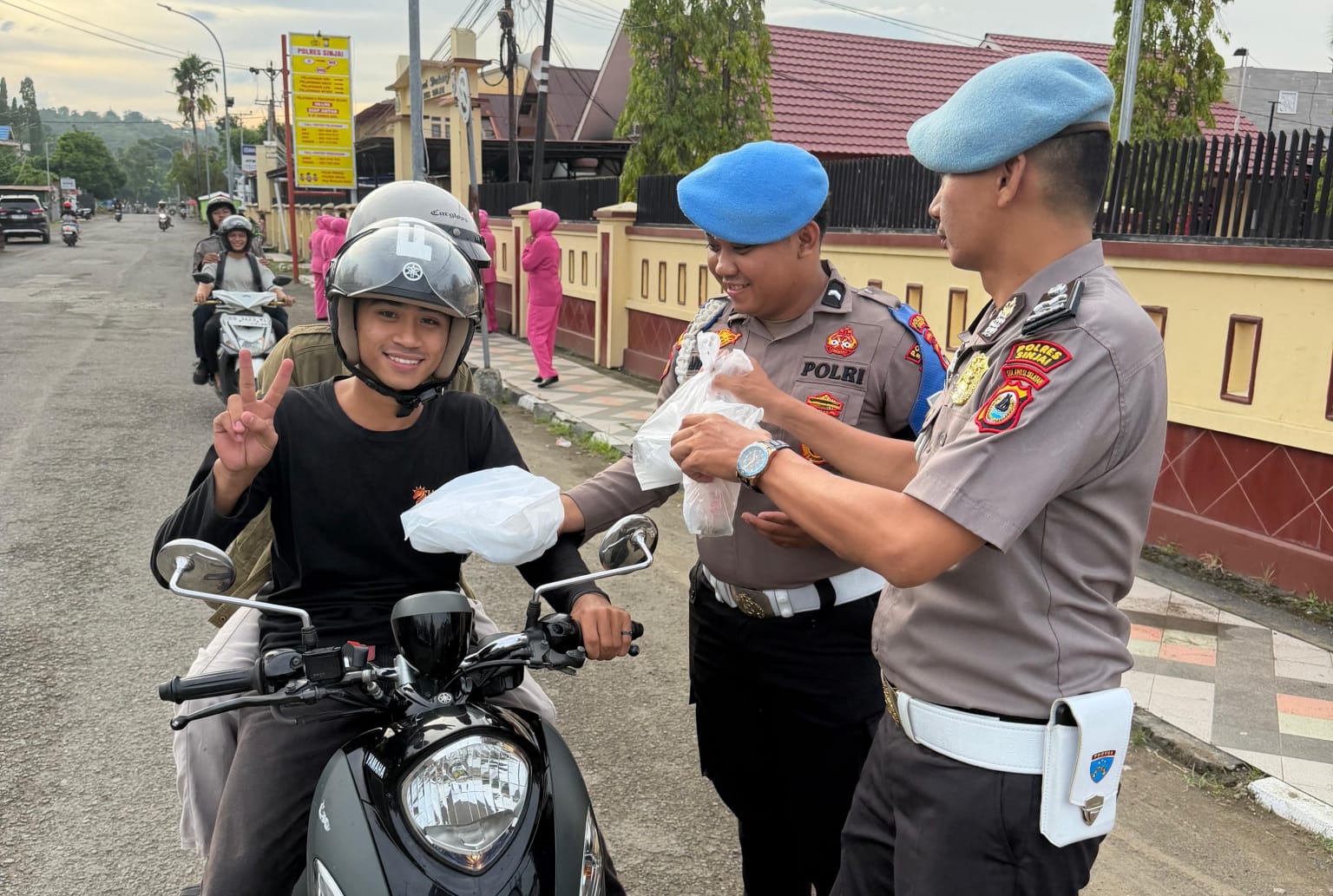 Dengan pendekatan persuasif dan penuh keakraban, personel menghentikan kendaraan secara bergiliran. Satu per satu paket takjil dibagikan sambil mengucapkan selamat menunaikan ibadah puasa kepada masyarakat.