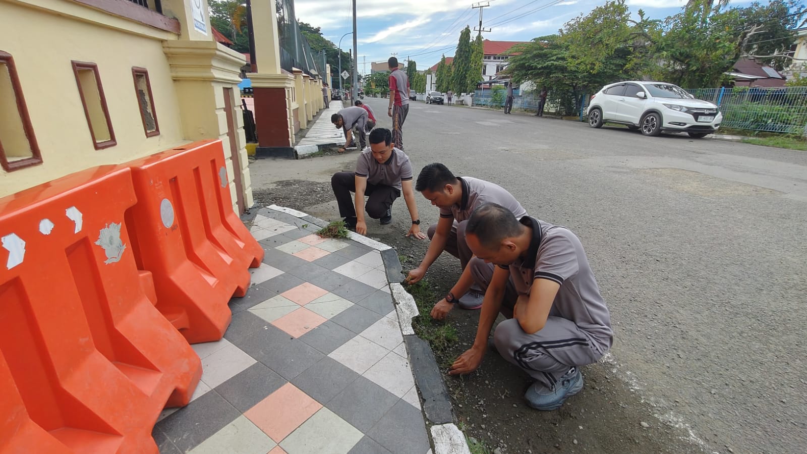 Seluruh personel turut ambil bagian tanpa terkecuali, menunjukkan semangat gotong royong dan kepedulian terhadap lingkungan kerja. Dengan perlengkapan sederhana, personel saling bahu-membahu membersihkan area Mako Polres Sinjai.