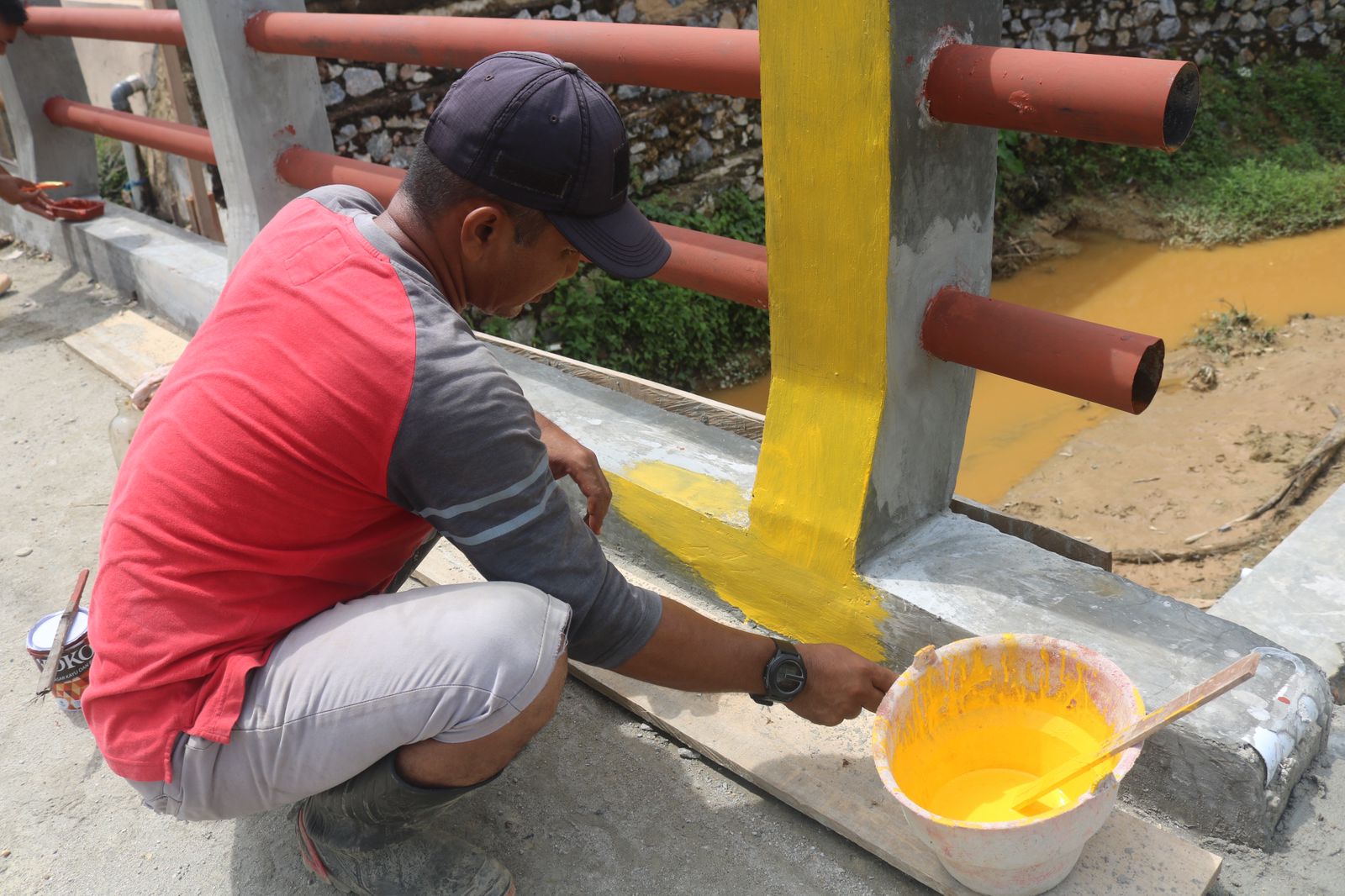 Dengan penuh ketelitian, para prajurit TNI bersama warga setempat bahu-membahu memoles pagar pembatas jembatan menggunakan kombinasi warna kuning dan merah yang mencolok.