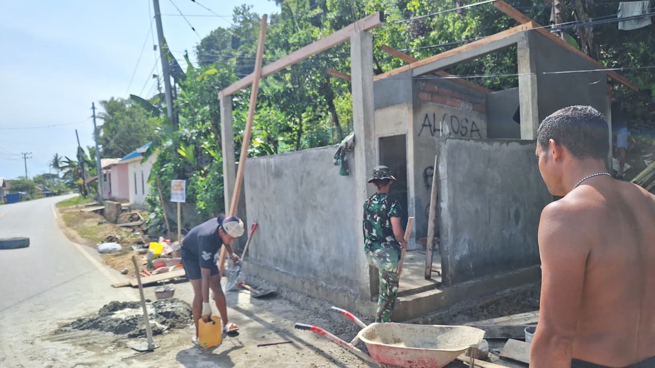Pada Selasa (3/3), terlihat personel TNI dengan penuh ketelitian melakukan proses plesteran dinding bagian dalam fasilitas Mandi, Cuci, Kakus (MCK).