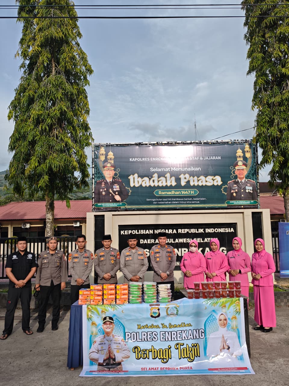 Aksi berbagi takjil ini digelar sebagai bentuk semarak berbagi kebahagiaan dan menebar kebaikan di bulan suci Ramadan 1447 Hijriah. Kegiatan dipimpin oleh Kasi Humas Polres Enrekang AKP Abd. Samad, S.H., M.H., yang didampingi oleh Iptu Alimuddin serta diikuti oleh personel Polres Enrekang dan Bhayangkari Cabang Enrekang.
