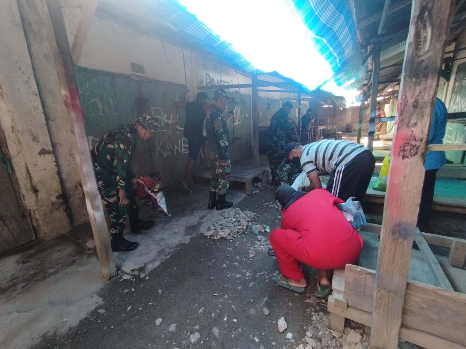 Dalam kegiatan tersebut, anggota Koramil 1413-09/Sampolawa bersama masyarakat setempat secara gotong royong membersihkan sampah yang berserakan di sekitar pasar dan lorong-lorong pasar.