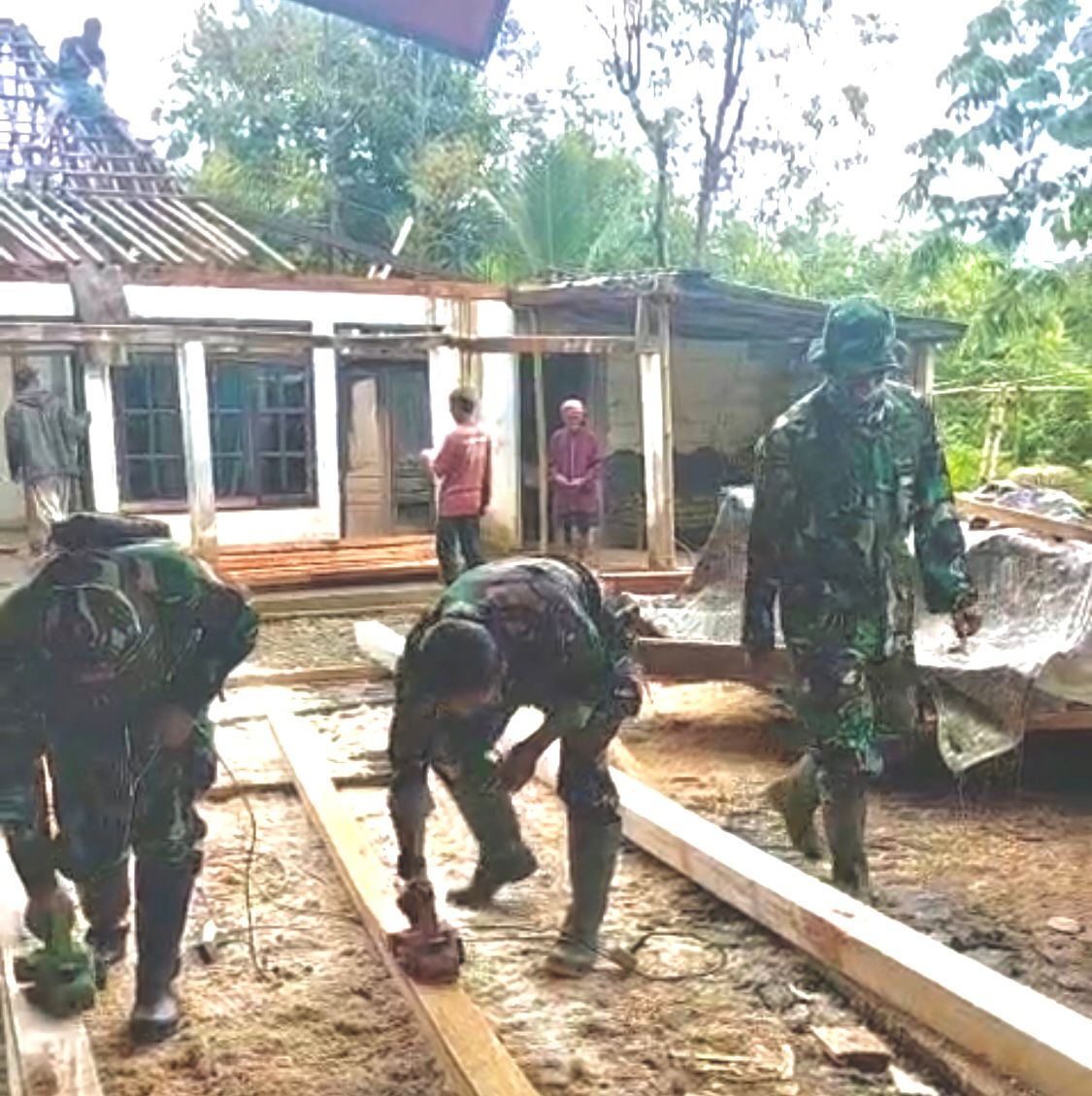 Seperi yang dilakukan Serka Suranto, Prajurit yang pernah berdinas di Komando Pasukan Khusus (Kopasus) sangat piawai menghaluskan permukaan kayu yang tidak rata untuk merakit kayu yang akan untuk atap rumahdengan menuggunakan mesin serut kayu.