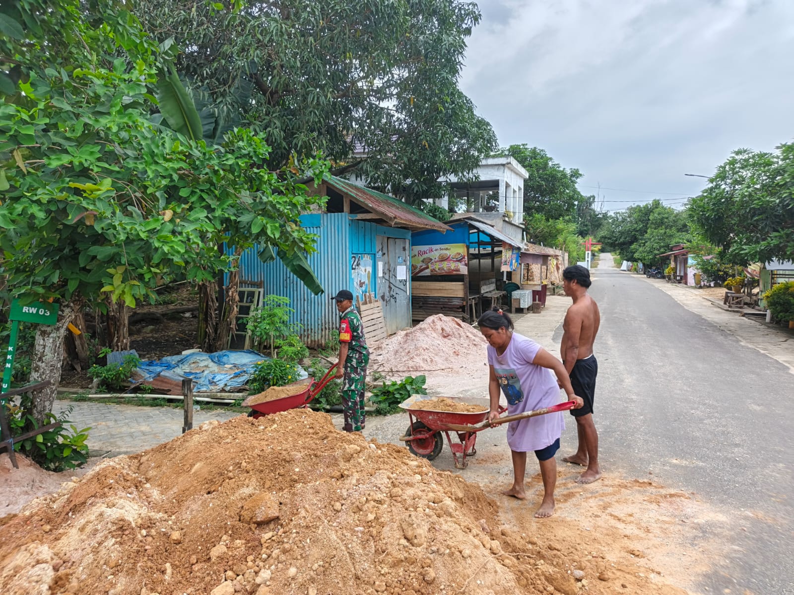 Di tengah kesibukan prajurit, sepasang suami istri setempat secara sukarela terjun langsung membantu personel Satgas melangsir material timbunan menggunakan gerobak dorong.