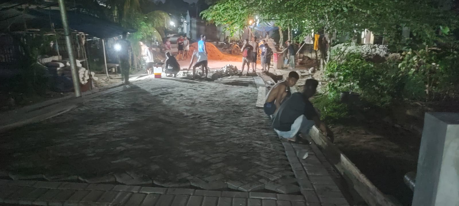 Meski diterangi cahaya lampu seadanya, antusiasme warga tidak surut dalam membantu para prajurit menyusun material paving. Sinergi ini menjadi bukti kuatnya kemanunggalan TNI dan rakyat dalam mendorong pembangunan infrastruktur di wilayah pinggiran kota.