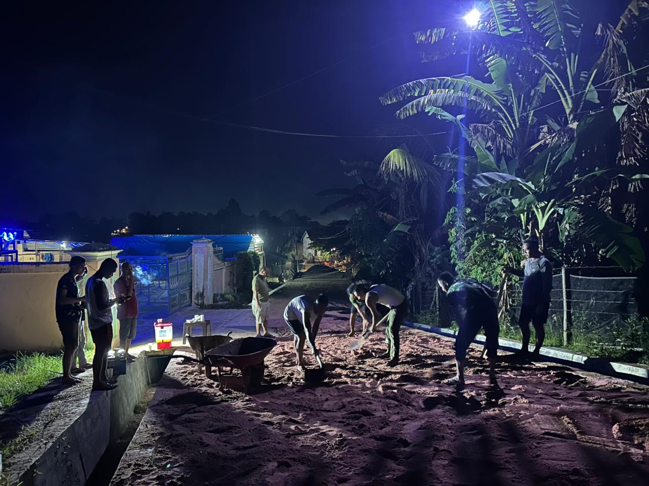 Di bawah penerangan lampu seadanya, anggota Satgas bekerja bahu-membahu memastikan landasan jalan rata dan siap untuk tahap penguncian material, guna memastikan akses jalan warga segera dapat digunakan.