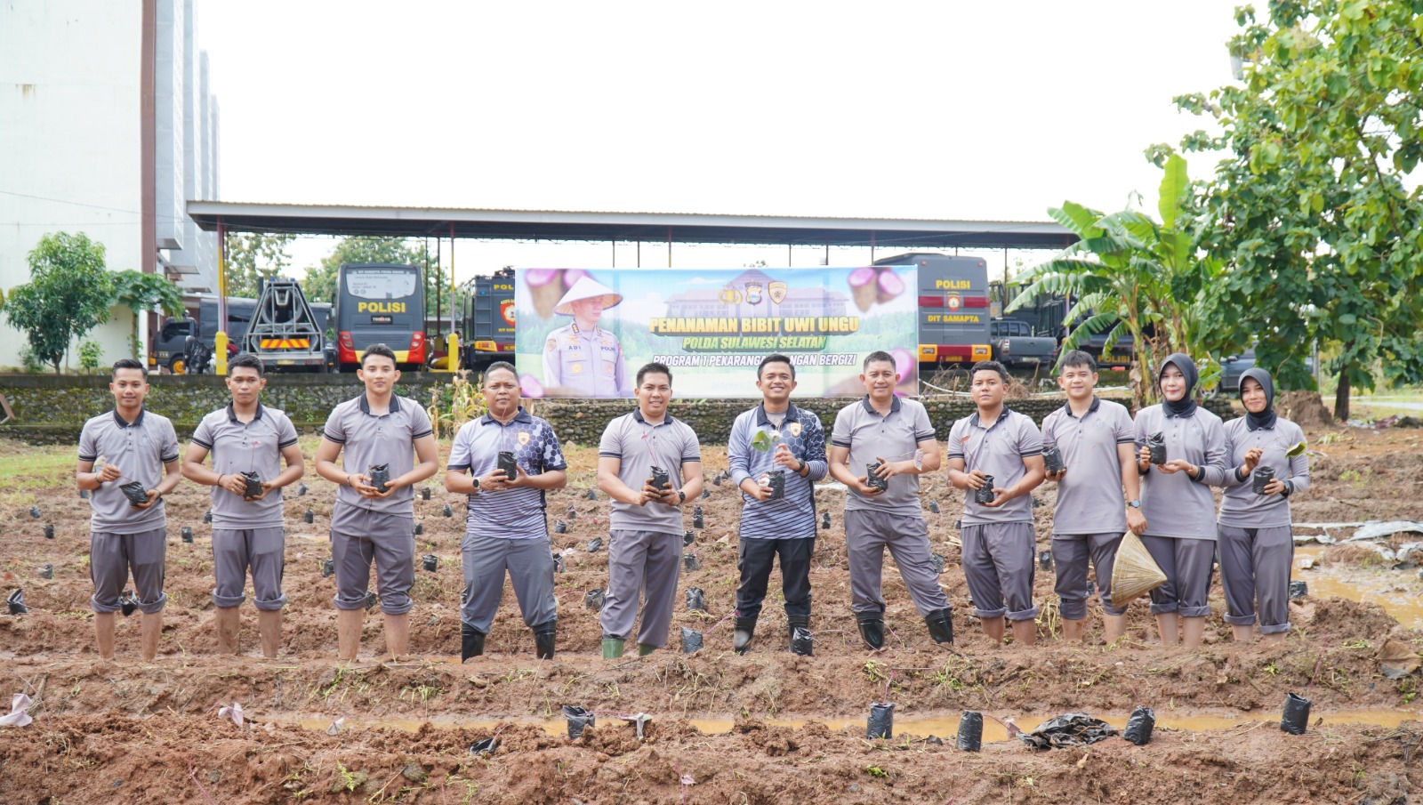Penanaman bibit uwi ungu dilaksanakan di lahan Polda Sulsel depan Rusunawa seluas 225 M2 dengan total bibit yang ditanam sebanyak 550 bibit yang telah melalui proses penyemaian selama 2 bulan.