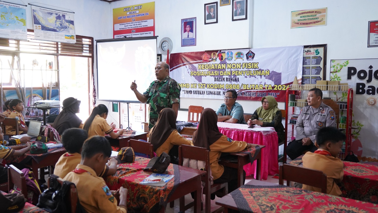 Blitar, fokustime.id- Personel Satgas TNI Manunggal Membangun Desa (TMMD) ke-127 Kodim 0808/Blitar terus menggencarkan sasaran non-fisik dengan memberikan pembekalan Wawasan Kebangsaan (Wasbang) kepada generasi muda. Kali ini, Kapten Inf Slamet memberikan materi langsung kepada siswa-siswi SDN Krisik 04 di Desa Krisik Kecamatan Gandusari Kabupaten Blitar, Jumat (6/3/2026).