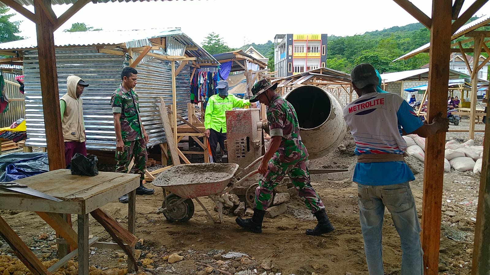 Buton ,fokustime.id— Anggota Koramil 1413-02/Pasarwajo DPP yang dipimpin Pelda La Hira melaksanakan kegiatan karya bakti pengecoran lantai pada pembangunan Pasar Kaloko non permanen di Kelurahan Takimpo, Kecamatan Pasarwajo, Kabupaten Buton, Selasa (10/2/2026).