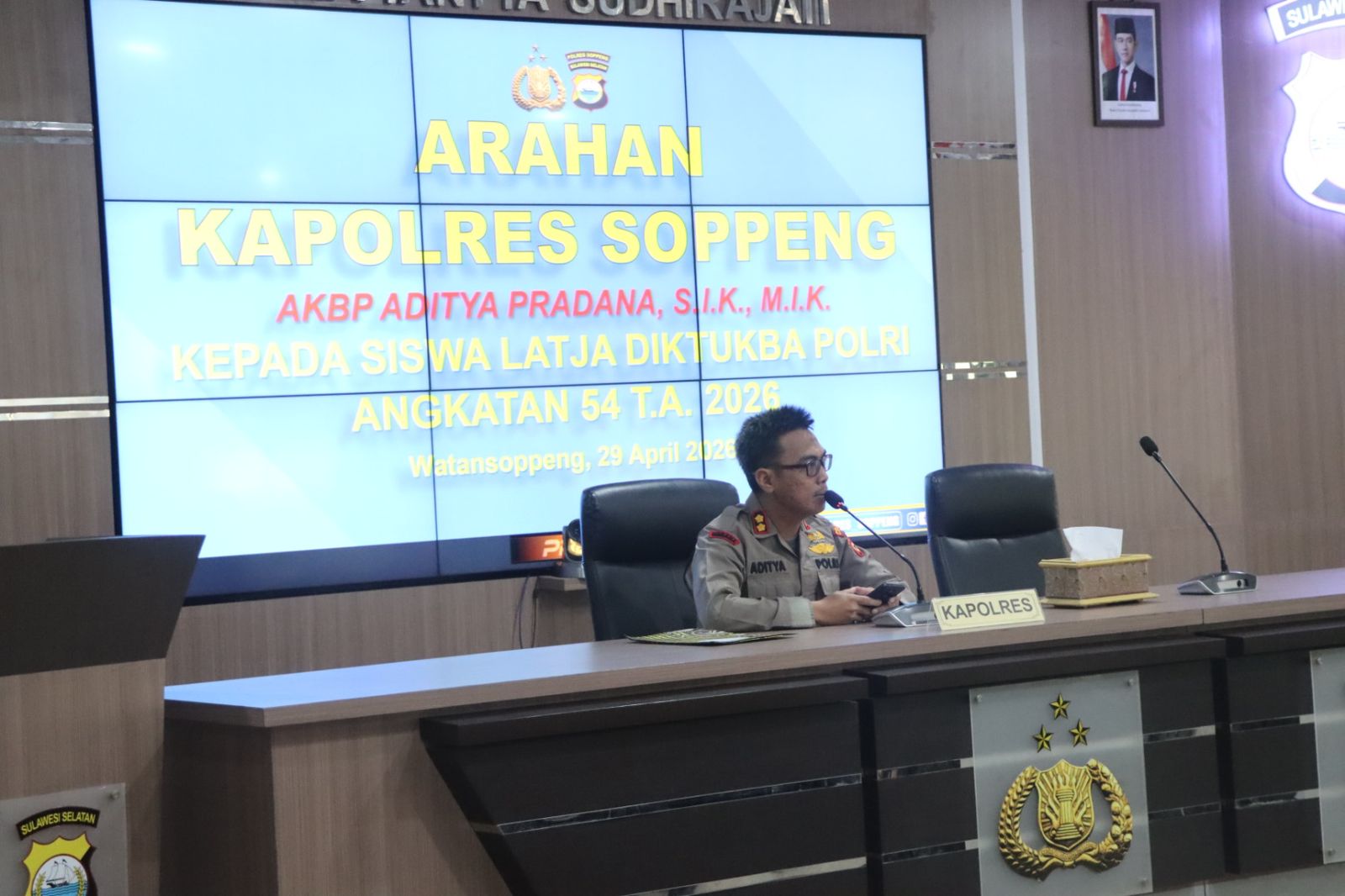 Soppeng,fokustime.id – Dalam rangka membentuk karakter personel Polri yang profesional dan berintegritas, Kapolres Soppeng AKBP Aditya Pradana, S.I.K., M.I.K. memberikan arahan kepada siswa Latihan Kerja (Latja) Diktukba Polri Angkatan 54 Tahun Anggaran 2026. Kegiatan tersebut berlangsung di Aula Tantya Sudhirajati Mapolres Soppeng. Rabu, 29 April 2026.