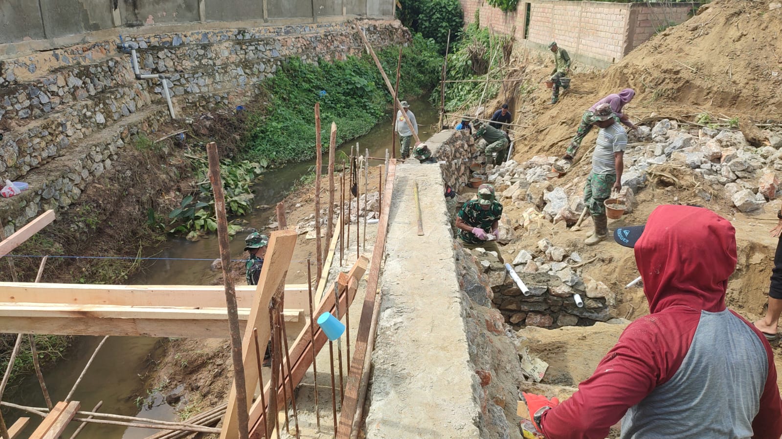 Kendari, fokustime.id– Memasuki tahapan krusial dalam program TNI Manunggal Membangun Desa (TMMD) ke-127, personel Kodim 1417/Kendari mulai melakukan pemasangan papan mal pada proyek pembangunan jembatan di Kelurahan Anggoeya, Kecamatan Poasia, Kota Kendari, Kamis (19/2).