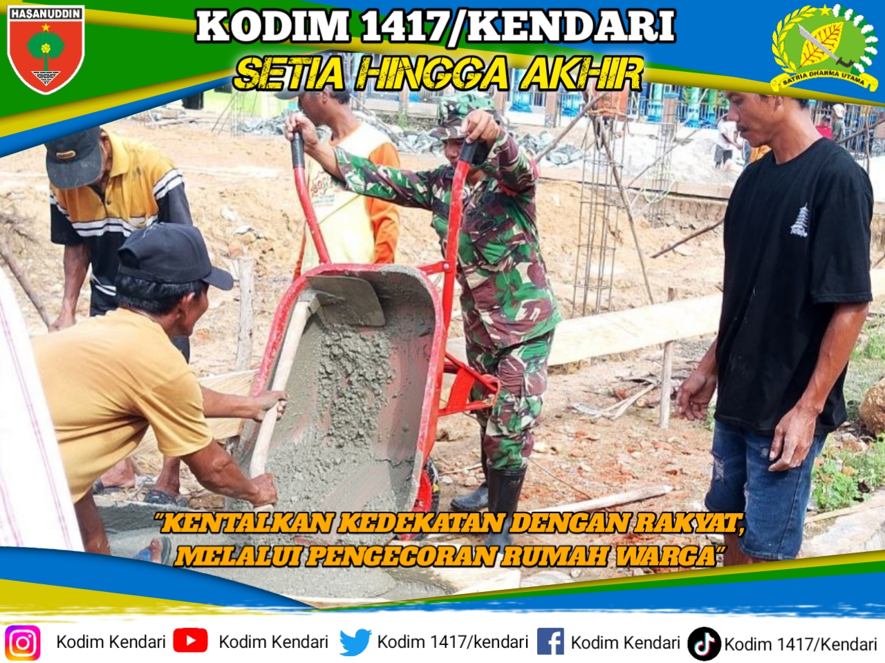 Dengan mengenakan seragam loreng kebanggaannya, Sertu Solleng tampak sigap membantu mengangkat material semen menggunakan gerobak dorong bersama warga setempat.